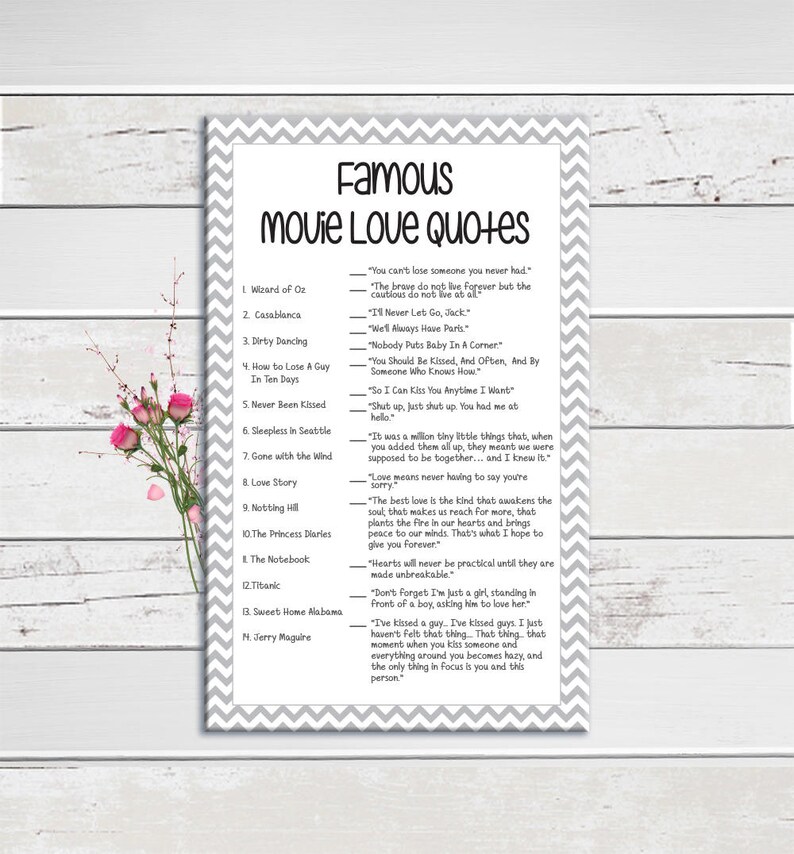 PNG. Bridal shower games printable, match the movie love quotes game, instant download, romantic movies matching trivia, wedding shower, floral. Create a list of movie quotes from your favorite romantic movies and have your guests guess which.